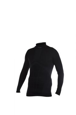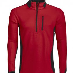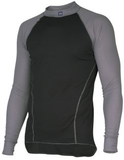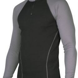 Functional undershirt with polo neck. Fits snugly to body. Short front zipper with zipguard to protect chin from chafing. Raglan sleeve. Extended back. No side seam, preventing chafing and irritation. Knit cuff at sleeve end. Two-tone with flat-lock seams in contrasting colour.