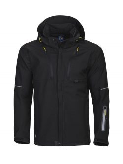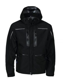 Functional layer 3 wind and water repellent softshell jacket. Two breast pockets, left with inner phone pocket. ID card holder. Two side pockets. Sleeve pocket on the left arm. Inner pocket on the left side with handsfree opening. Ventilation zippers under armpits. Drawcord waist. Adjustable cuffs. Extended back panel for better comfort. Reflective piping on sleeves and back. Removable and adjustable hood. Fleece lined collar for better comfort.